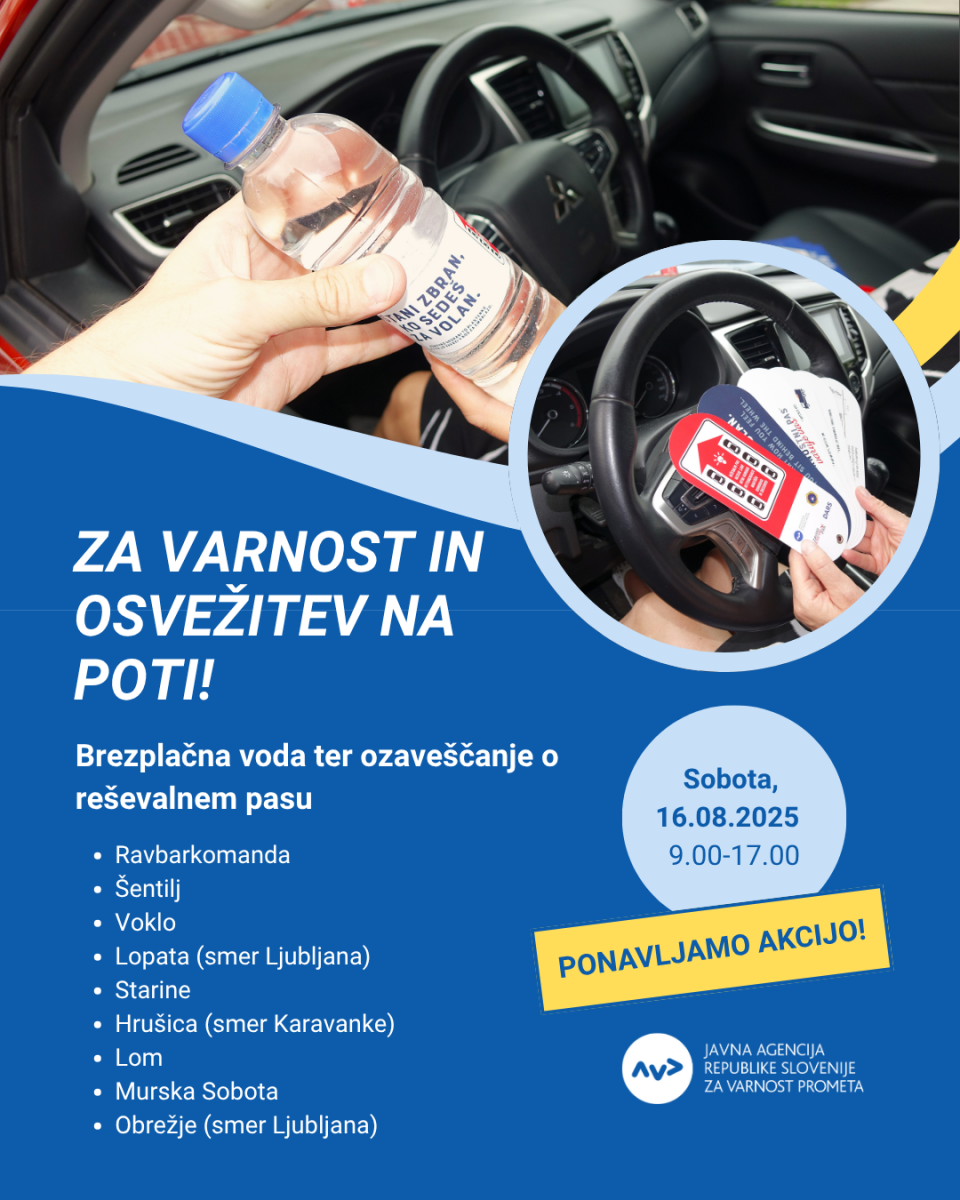 Pred nami je podaljšan vikend, nadaljuje se vročinski val, na naših cestah pa prometni koledar napoveduje zelo visoko gostoto prometa. Številni domači in tuji turisti se vračajo domov po praznikih, končujejo se tudi poletne šolske počitnice v delu Švice, Nizozemske in Nemčije, na cestah pa promet dodatno ovirajo dela, zastoji in občasno tudi poletne nevihte. Agencija za varnost prometa (AVP) bo zato v soboto, 16. avgusta, med 9. in 17. uro na počivališčih večjih bencinskih servisov ob avtocestah voznikom ponovno delila brezplačno vodo z napisom Ostani zbran, ko sedeš za volan in izobraževalne letake Ustvari reševalni pas v šestih jezikih. Z aktivnostmi v sklopu akcije Varno v poletje želijo prispevati k večji varnosti na naših cestah v prometno obremenjenih dneh; voznike pozivajo k vzpostavitvi reševalnega pasu ob zastojih, obvezni uporabi varnostnega pasu, vožnji brez uporabe mobilnega telefona in brez uživanja alkohola. V zadnji podobni akciji, 12. julija, je AVP razdelila približno 3.900 plastenk vode in letakov, odziv domačih in tujih voznikov pa je bil izjemno pozitiven.