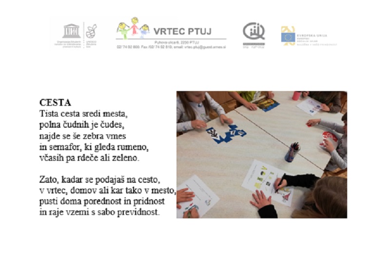 V Vrtcu Ptuj skozi celo šolsko leto veliko pozornost namenjamo tudi vsebinam iz področja prometne varnosti, v tem tednu pa so vzgojiteljice otroke še poglobljeno seznanjale z varnim vedenjem in vključevanjem v promet, v izogib prometni nesreči. Otroci so se skozi pogovor, igro in gibanje preizkusili v konkretnih prometnih izkušnjah, se učili varno prečkati cesto, pri vožnji z raznimi vozili razvijali strpnost, koordinacijo in utrjevali pravilno upoštevanje prometnih znakov. Ob tem so se tudi plesno izrazili ob pesmi Semafor in se naučili deklamacijo Cesta.