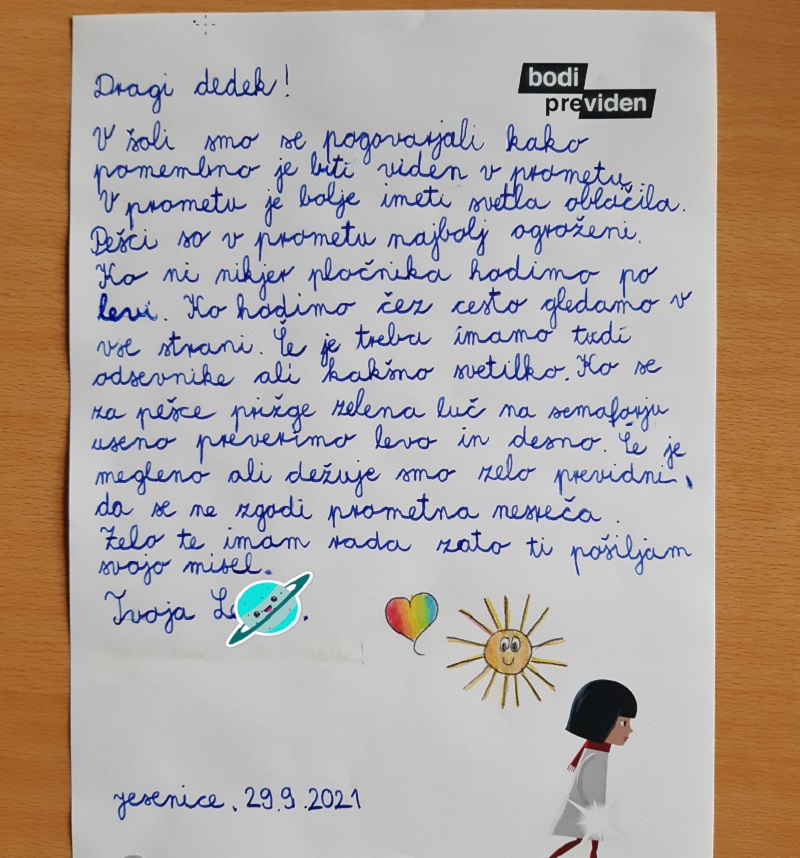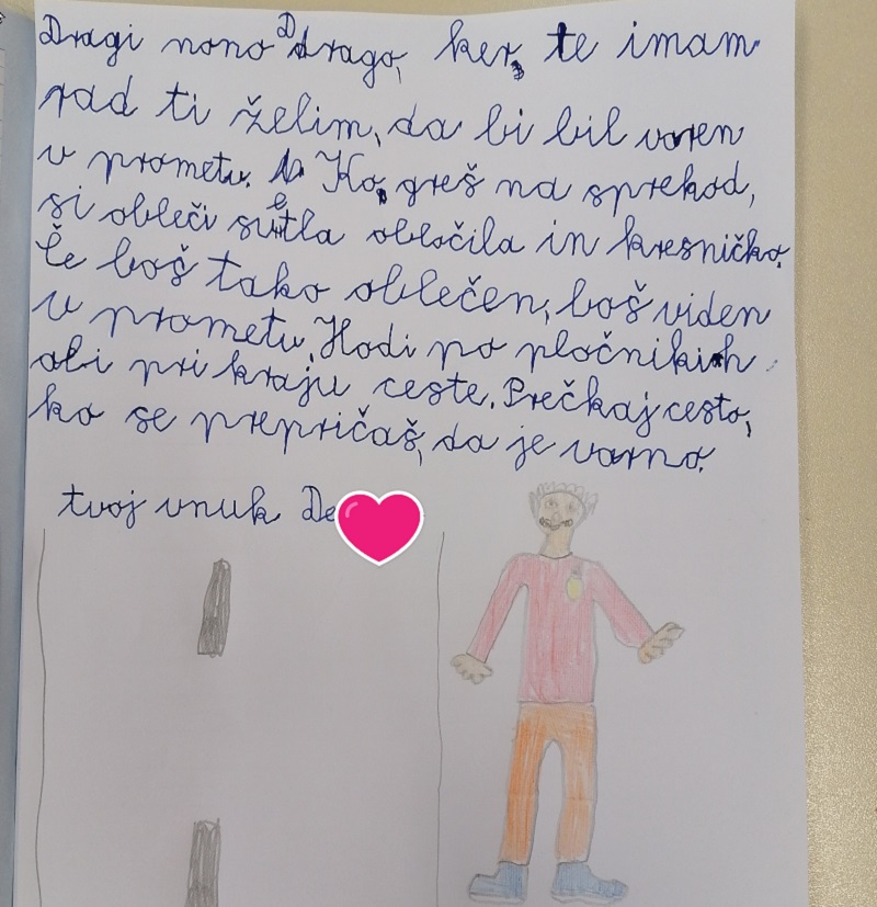 V Osnovni šoli Juršinci so v sklopu predmeta kolesarstvo (priprava na teoretični del izpita) napisali pisma babicam in dedkom na temo kako pomembno je biti viden v prometu. Opisali smo jim, kaj vse lahko naredijo, da bodo vidni podnevi in ponoči, kako se je potrebno obnašati v prometu ter kako lahko ozaveščamo druge o pomembnosti le tega.