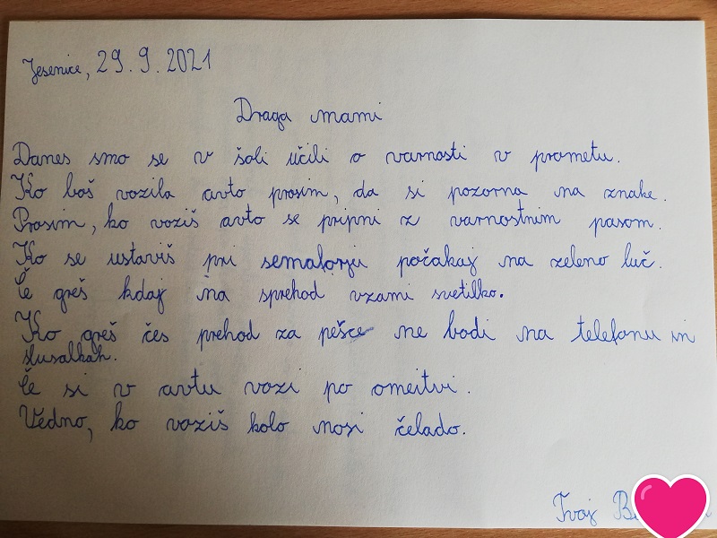 Mama, zelo te imam rada, pazi na vidnost v dežju in megli. Daj trak na roko...(Anže)