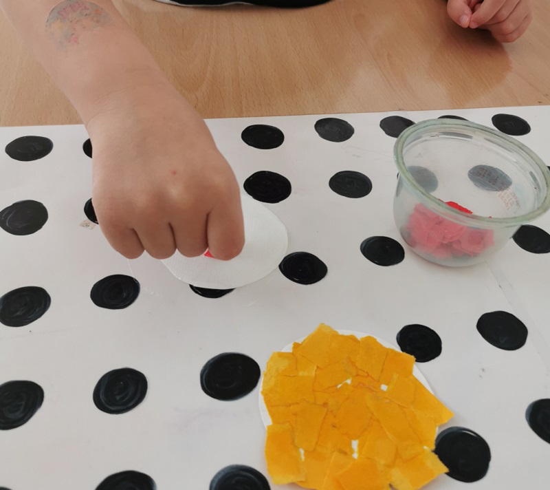 S trganjem in lepljenjem rdečih, rumenih in zelenih koščkov papirja so spoznali vrstni red barv luči na semaforju ter njihov pomen.