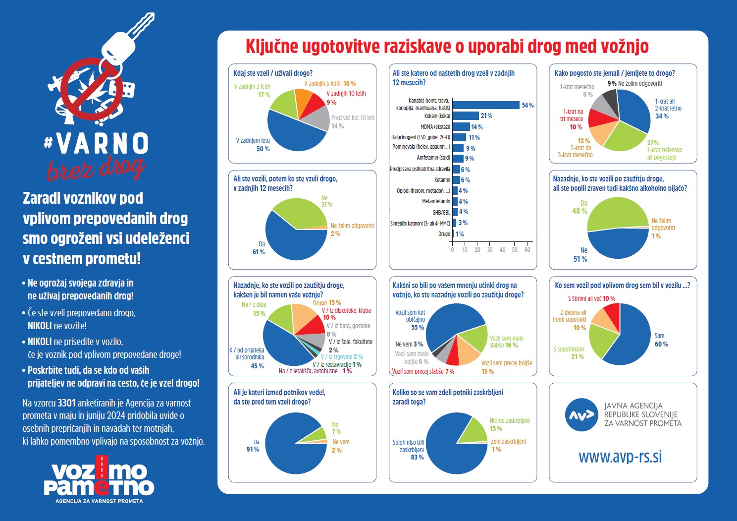 (Ljubljana, 17. junij 2024) Sodeč po najnovejši raziskavi, je 61 % slovenskih voznikov, ki so v zadnjih 12 mesecih zaužili drogo, potem tudi sedlo za volan. Od vprašanih, ki so vozili po zaužitju droge, je skoraj tri četrtine (74 %) uživalo kanabis, sledijo kokain (32 %) in amfetamini (14 %). Skoraj polovica ali 48 % vprašanih poroča, da so ob uporabi droge tudi pili alkohol, medtem ko jih je 51 % vozilo samo pod vplivom droge. Gre za izsledke posebne raziskave Uporaba drog, alkohola in drugih psihoaktivnih snovi v povezavi z vožnjo motornega vozila, ki jo je izvedla Agencija za varnost prometa v okviru nove Nacionalne preventivne akcije »Droge«.